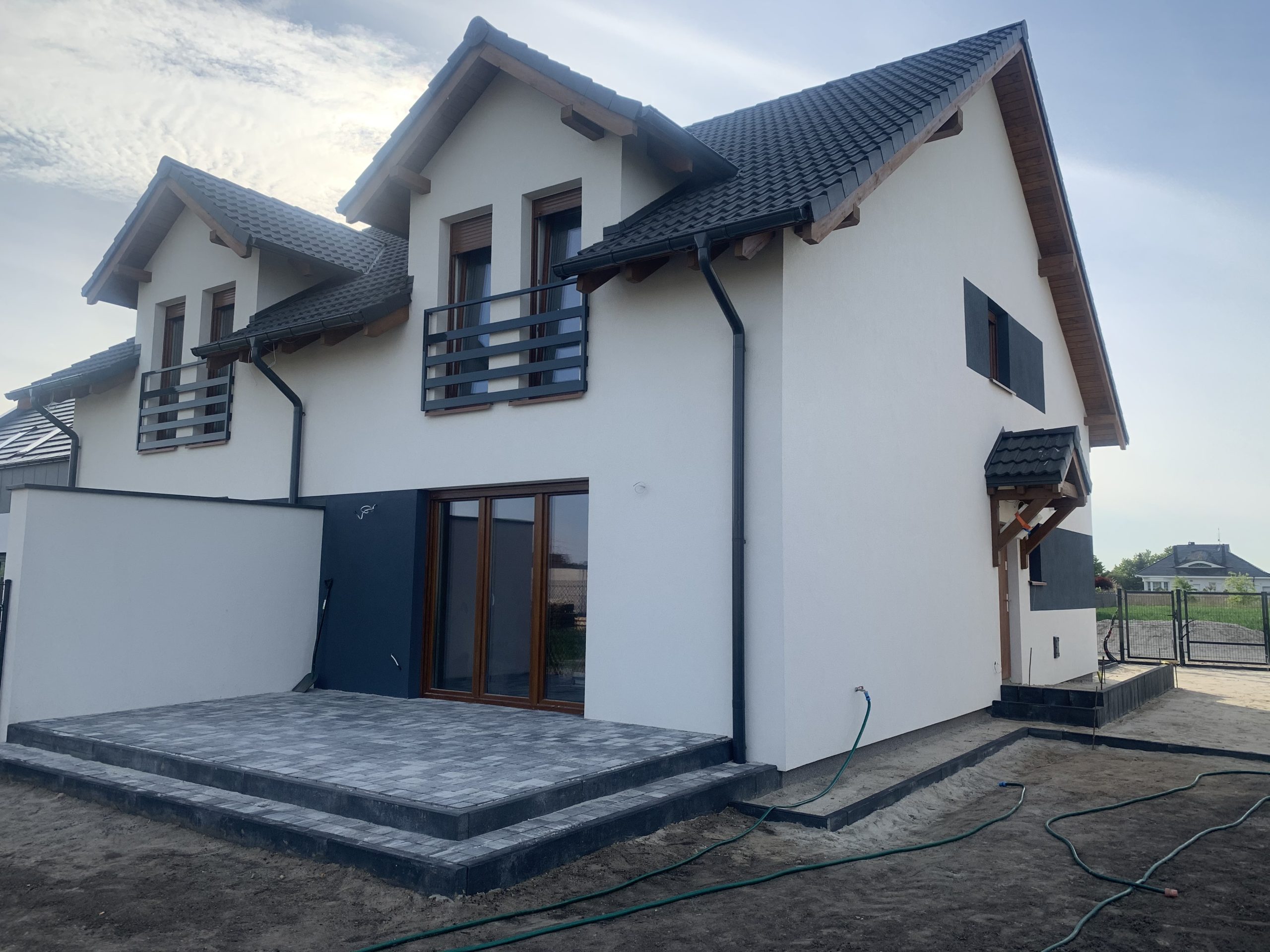 - Brama oraz furtka z poziomych profili stalowych malowanych proszkowo w kolorze grafitowym (wyprowadzone zasilanie pod domofon oraz automatykę do bramy)
